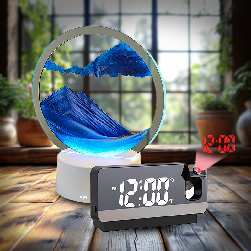 Настільний дзеркальний годинник з проектором часу – Електронний годинник з цікавим дзеркальним рішенням дисплея – це ефектний та необхідний елемент дизайну у вашому інтер’єрі. Світлодіодне підсвічування дозволить вам навіть у темну пору доби правильно зорієнтуватися в часі, а наполегливий дзвінок будильника приємно розбудить вас у потрібний час.