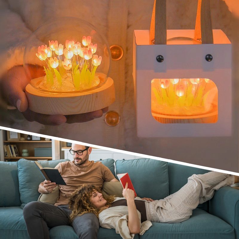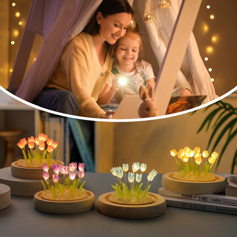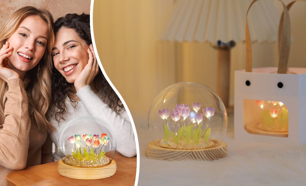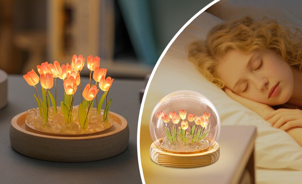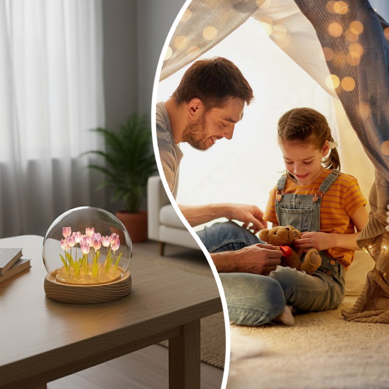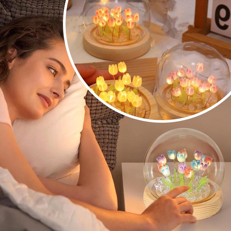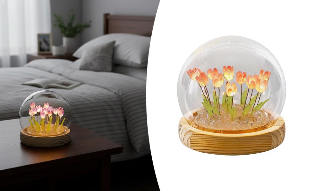 Настільний нічник тюльпани в скляній колбі з LED-підсвічуванням створює затишну та теплу атмосферу в кімнаті. Елегантний дизайн з ніжними тюльпанами в скляній колбі стане стильним доповненням інтер’єру та підходить для дитячої, спальні або вітальні.