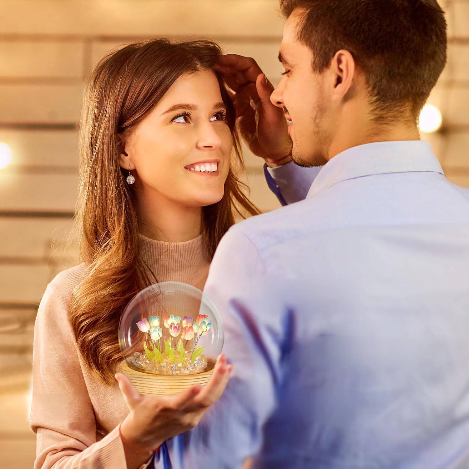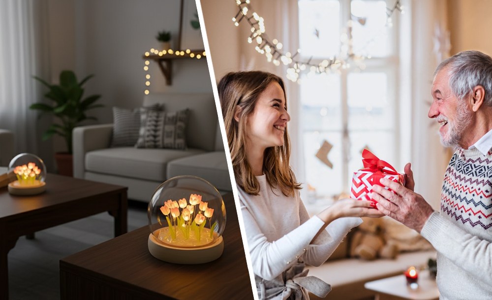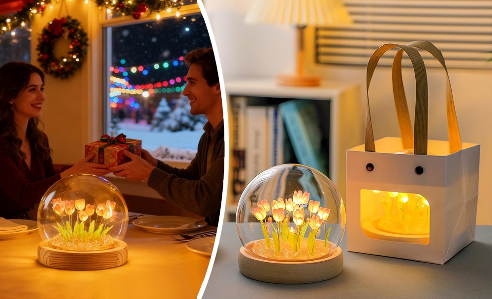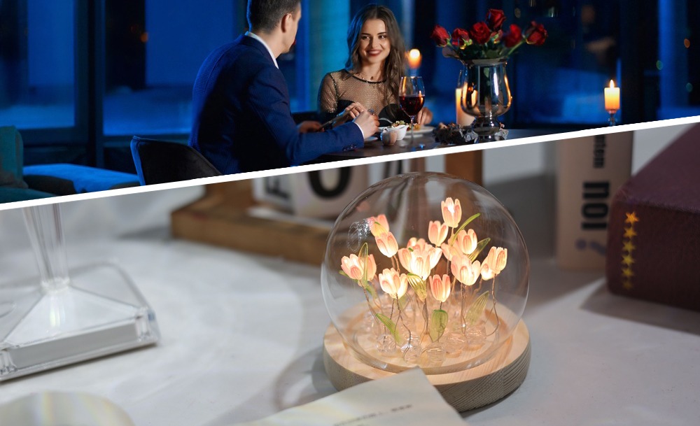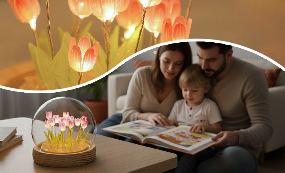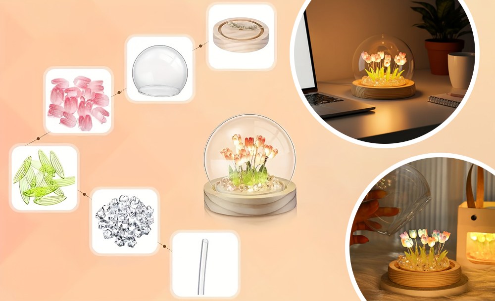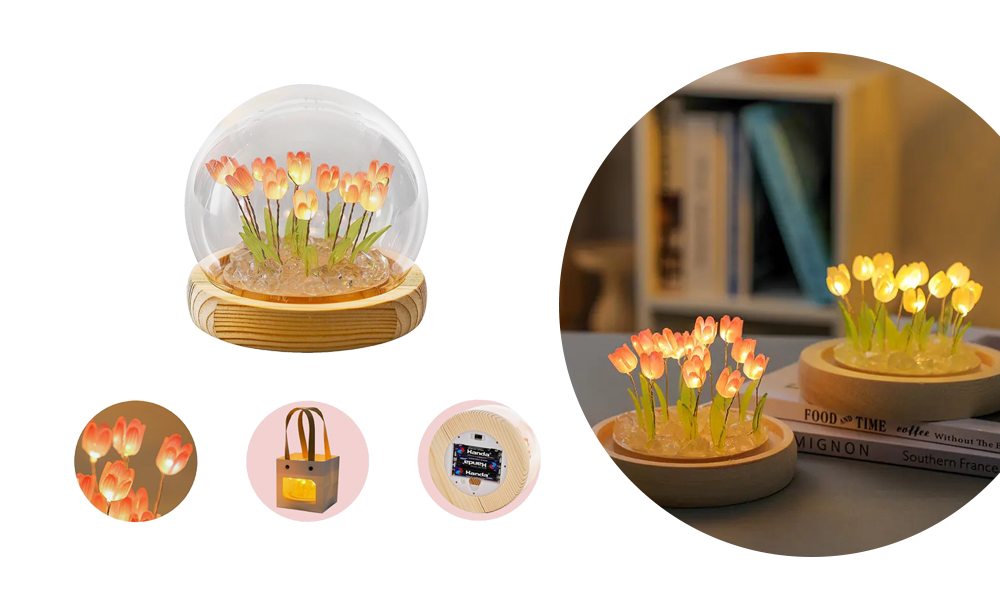 Настільний нічник тюльпани в скляній колбі з LED-підсвічуванням створює затишну та теплу атмосферу в кімнаті. Елегантний дизайн з ніжними тюльпанами в скляній колбі стане стильним доповненням інтер’єру та підходить для дитячої, спальні або вітальні.