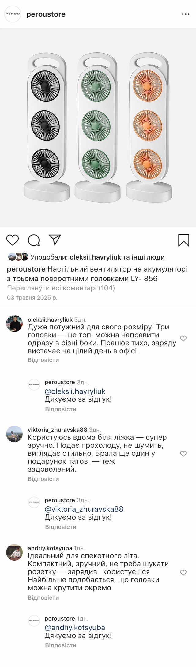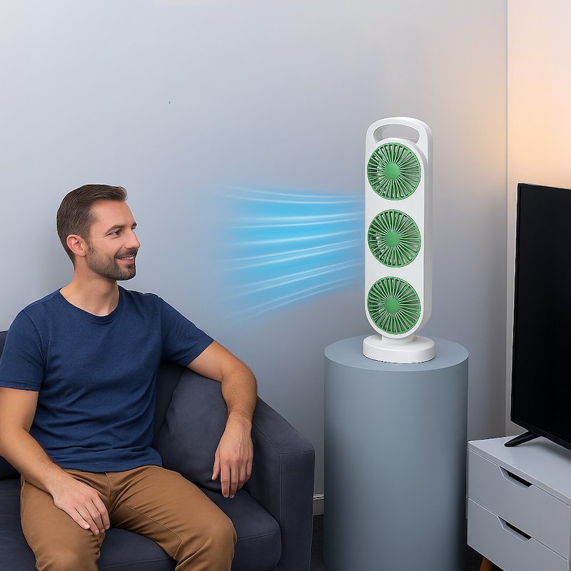 Настільний вентилятор LY-856 оснащений вбудованим акумулятором, що забезпечує автономну роботу без підключення до мережі. Завдяки трьом поворотним головкам можна регулювати напрямок повітря для рівномірного охолодження. Компактний і легкий, він зручний для використання вдома, в офісі чи в дорозі.