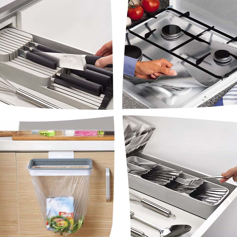 Органайзер для столових приладів дозволить заощадити місце і компактно та акуратно зберігати кухонні аксесуари. Тримач для сміттєвих пакетів з герметичною кришкою легко замінить об’ємне відро або урну. Його можна зафіксувати на дверцятах шафи або на будь-якій іншій поверхні, щоб заощадити простір.