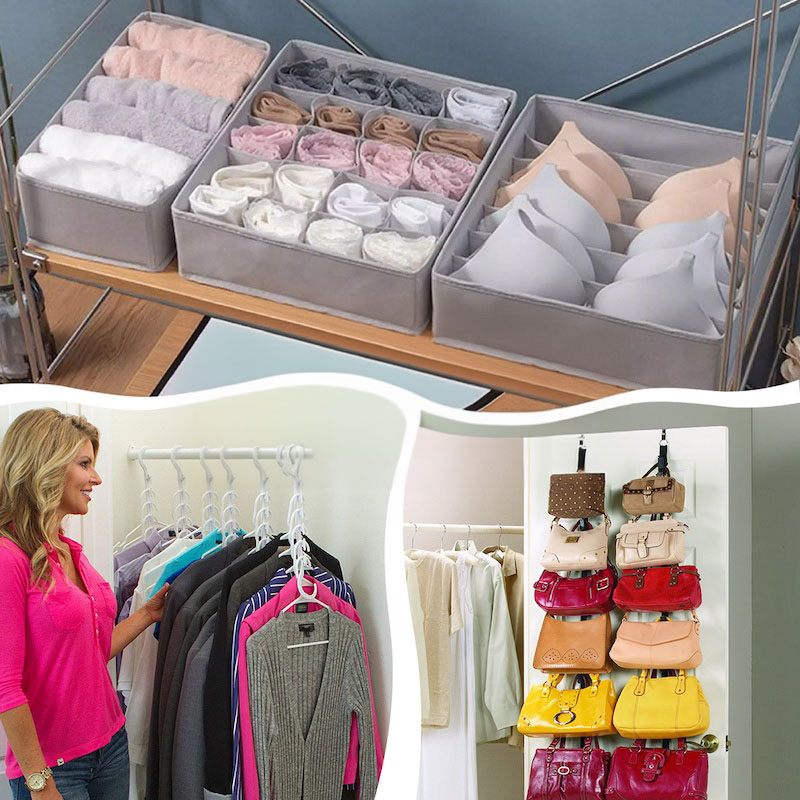 Універсальна вішалка з 5 перекладинами замість однієї допоможе навести порядок в шафі, повісивши відразу кілька пар штанів, спідниць або сорочок за допомогою спеціальних затискачів і петель. Органайзер для зберігання сумок можна розташувати в будь-якому зручному місці – всередині шафи, на двері або на стіні, розмістивши на ньому до 16 сумок різних розмірів.