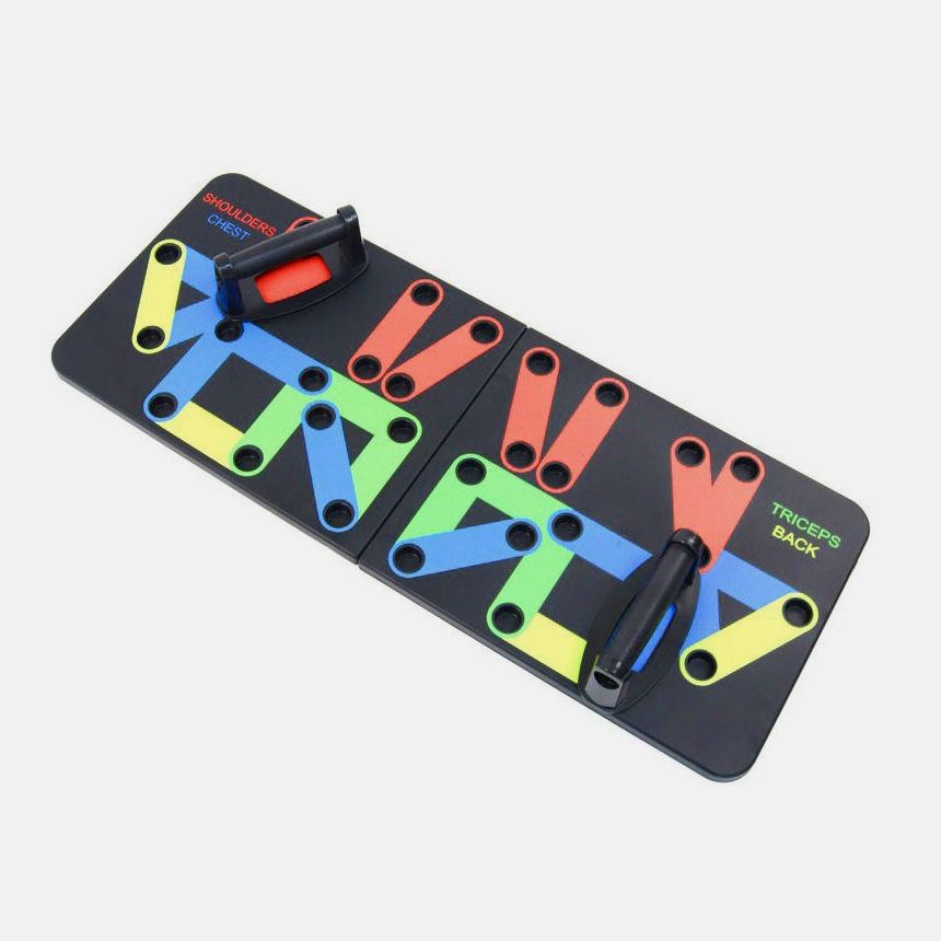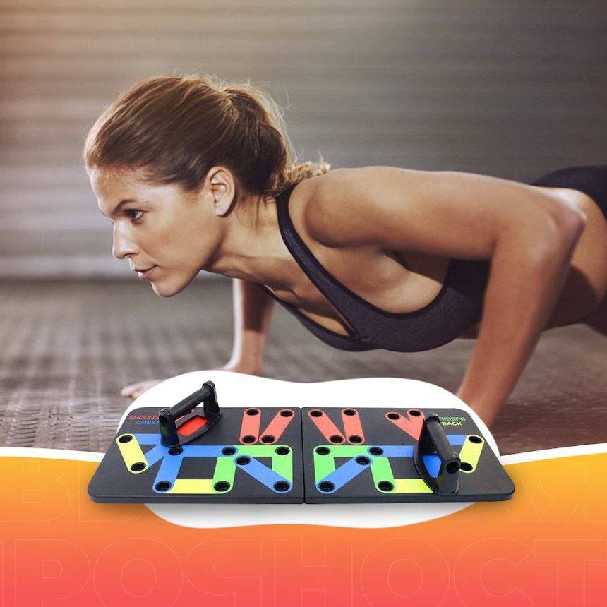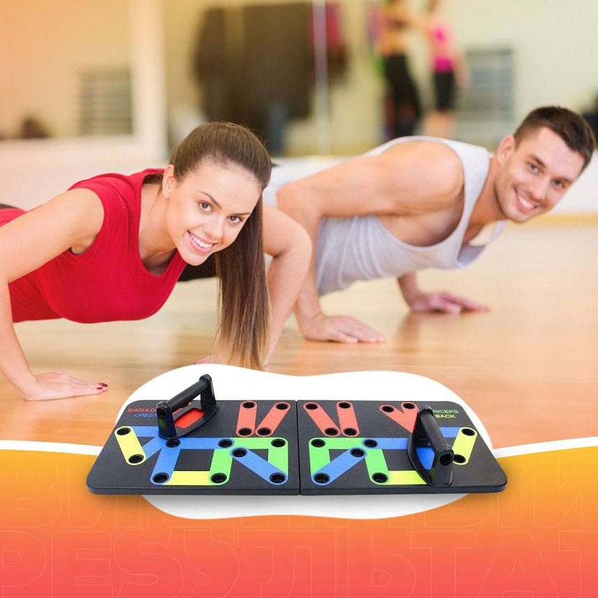 Спортивна дошка з упорами для віджимань, розмічена за спеціальною системою вправ на різні групи м’язів і зон торса – плечі, спину, руки, груди. Вона витримує інтенсивні щоденні навантаження і створена для регулярних вправ, витримує до 150 кг.