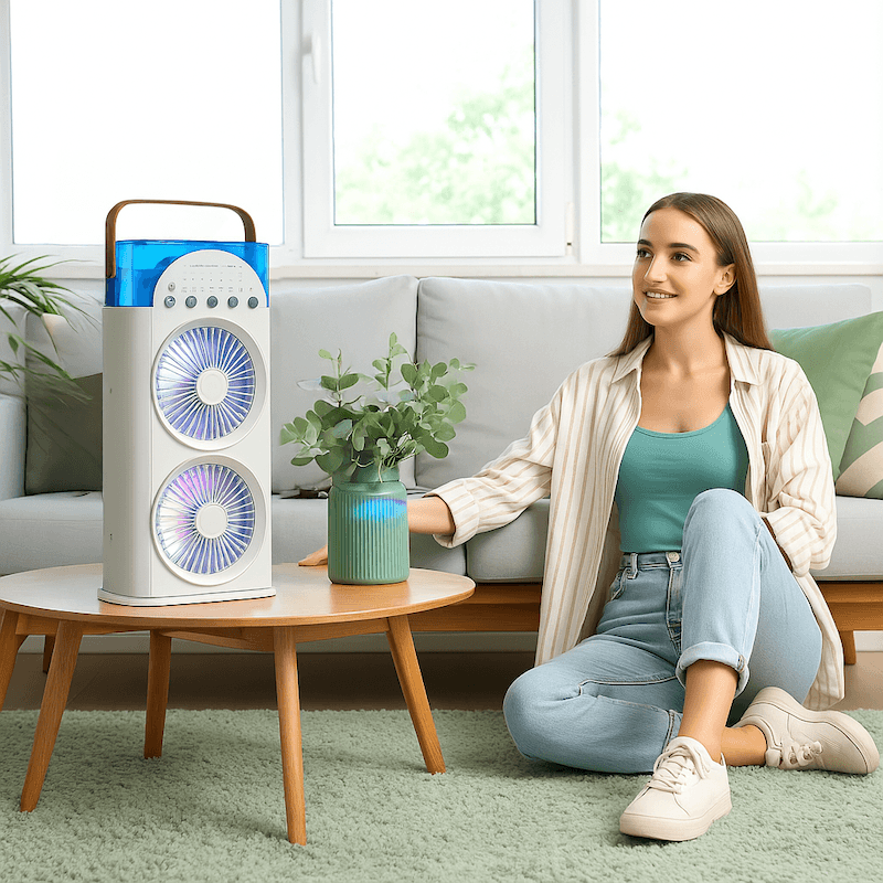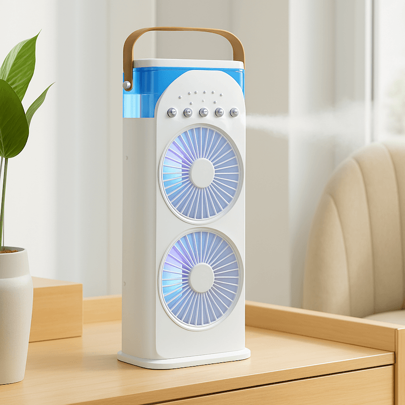 Портативний подвійний вентилятор-кондиціонер із яскравою LED-підсвіткою та функцією розпилення водяного туману забезпечує ефективне охолодження в будь-яких умовах. Ідеально підходить для зручного використання вдома, в офісі або на природі — легкий, компактний та зручний у щоденному користуванні.