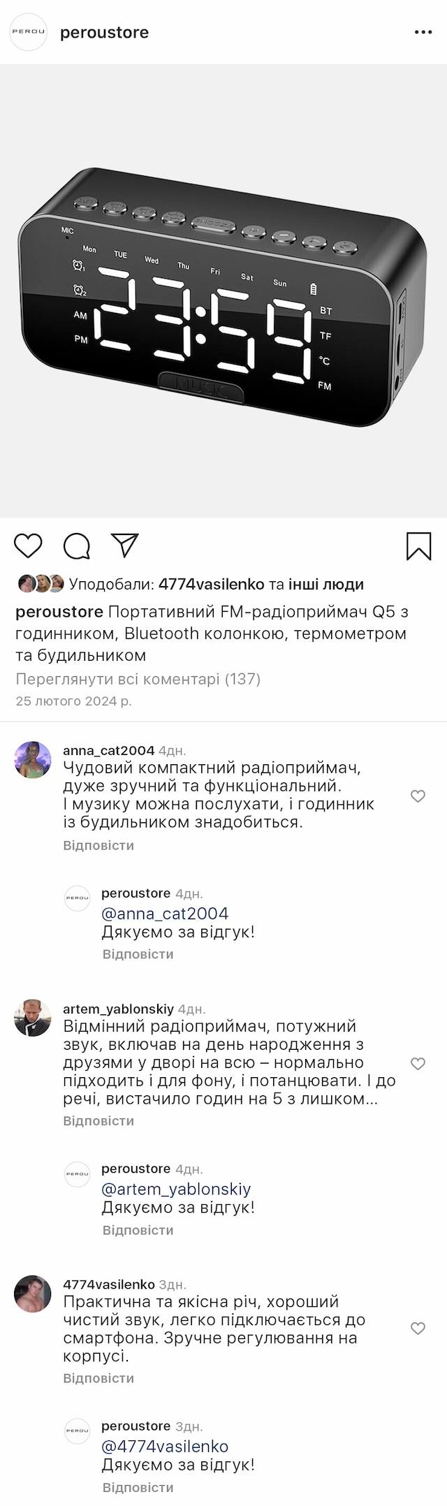 Безпровідний портативний радіоприймач – це універсальний пристрій, оснащений годинником, будильником і градусником, що робить його практичним й функціональним. Невеликі розміри та легкість радіоприймача дає можливість використовувати його не лише вдома, а й у поїздці, на дачі чи природі.