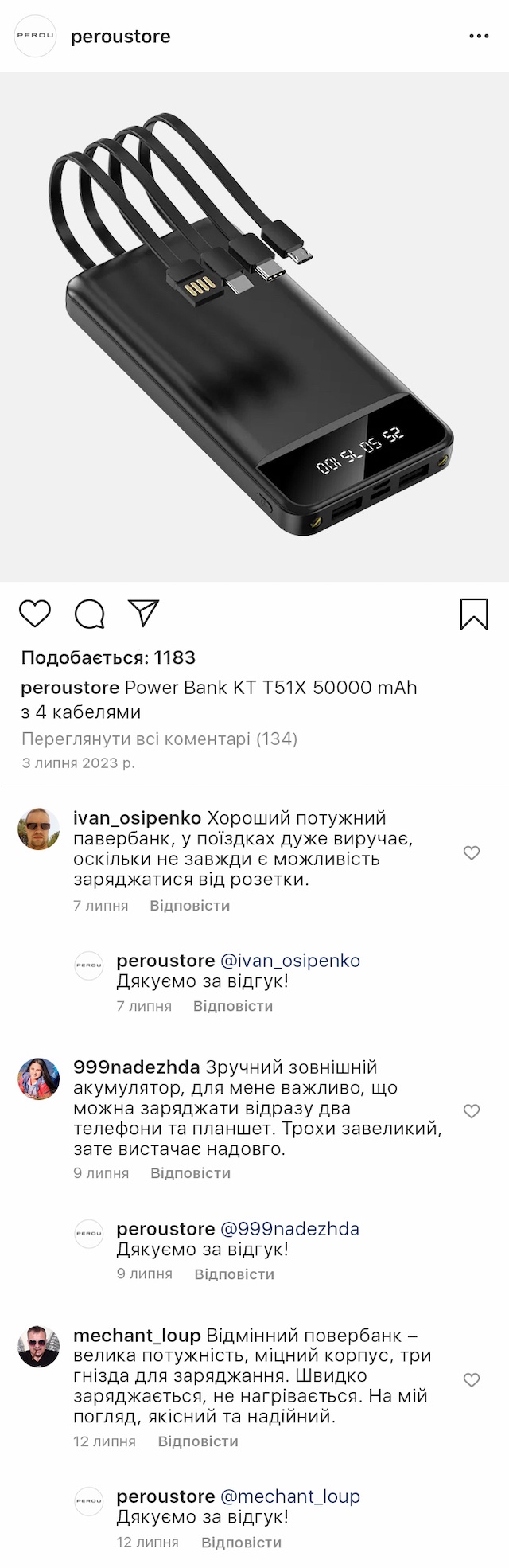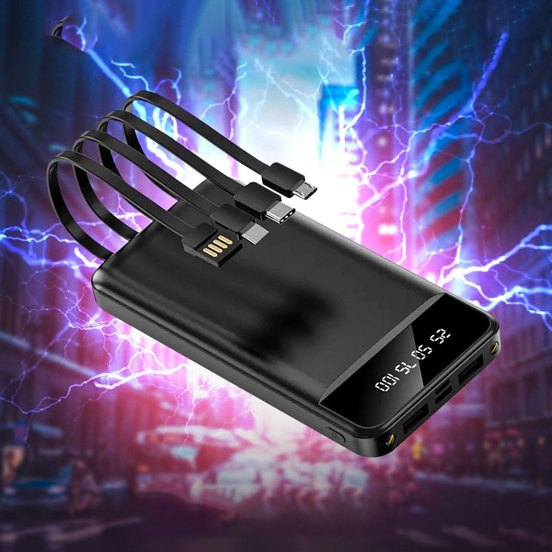 Пристрій має 4 кабелі та 2 USB-порти, що дозволяє заряджати 4 гаджети одночасно. Вбудована інтелектуальна система захищає від перевантажень, перегріву та короткого замикання, а світлодіодний індикатор із чітким дисплеєм показує рівень заряду.