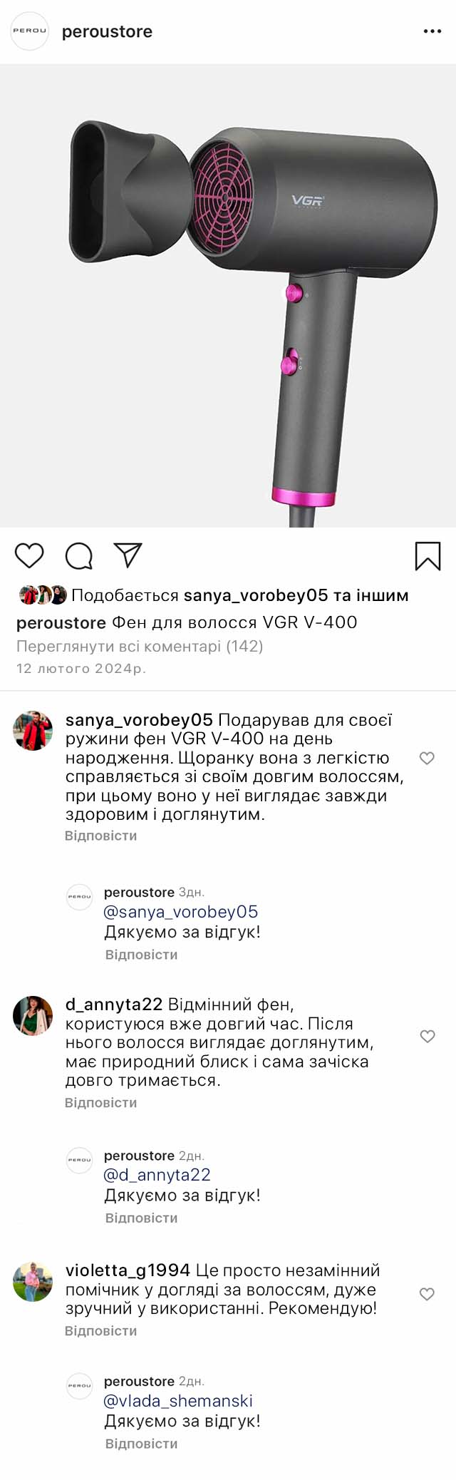 Професійний фен VGR V-400 призначений для швидкого сушіння та укладання волосся. Змінна потужність двигуна 1800-2000 Вт, із вбудованим пристроєм від перегріву, забезпечує повну безпеку під час його використання.