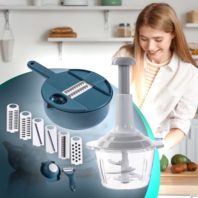 Овочерізка ручна 12 в 1 з чашею об’ємом 1,8 літра — це зручний та ефективний пристрій для нарізування та подрібнення овочів і фруктів. Завдяки своїм численним функціям терка дає змогу швидко та легко приготувати різноманітні страви, салати та закуски.