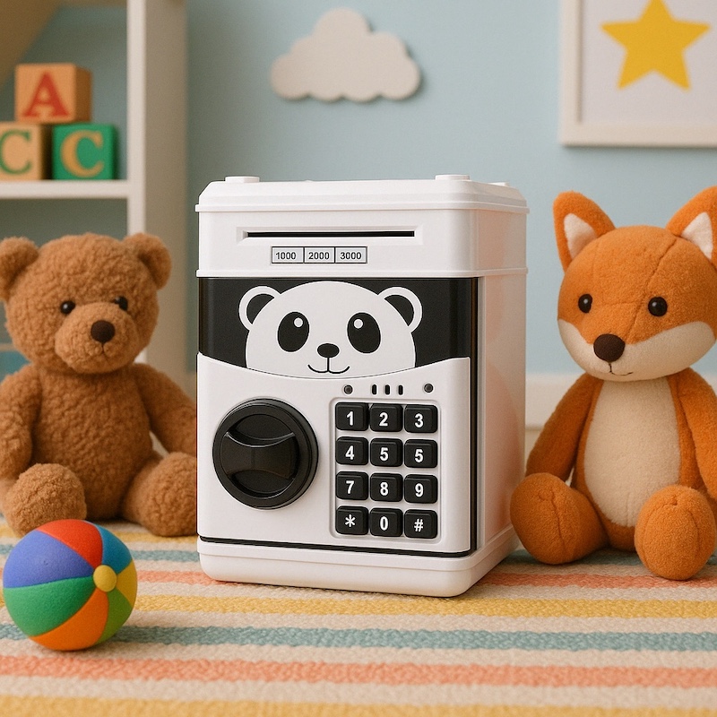 «Електронний сейф» оснащений справжнісінькою системою безпеки: незачинені дверцята пищать, нагадуючи про себе. Якщо ви або дитина, якій подарували таку скарбничку, забули код, а купюри дістати необхідно, достатньо вийняти батарейки — це відновить заводський код «0000».