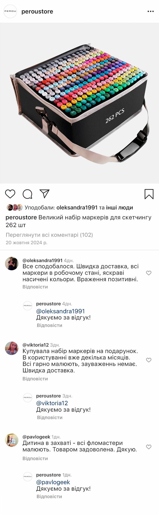 Маркери мають два пера – тонке та широке. Заправлені без кислотним нетоксичним чорнилом. Відмінно поєднуються, створюють плавні градієнти. Вся палітра кольорів цих маркерів складається з 262 кольорів.