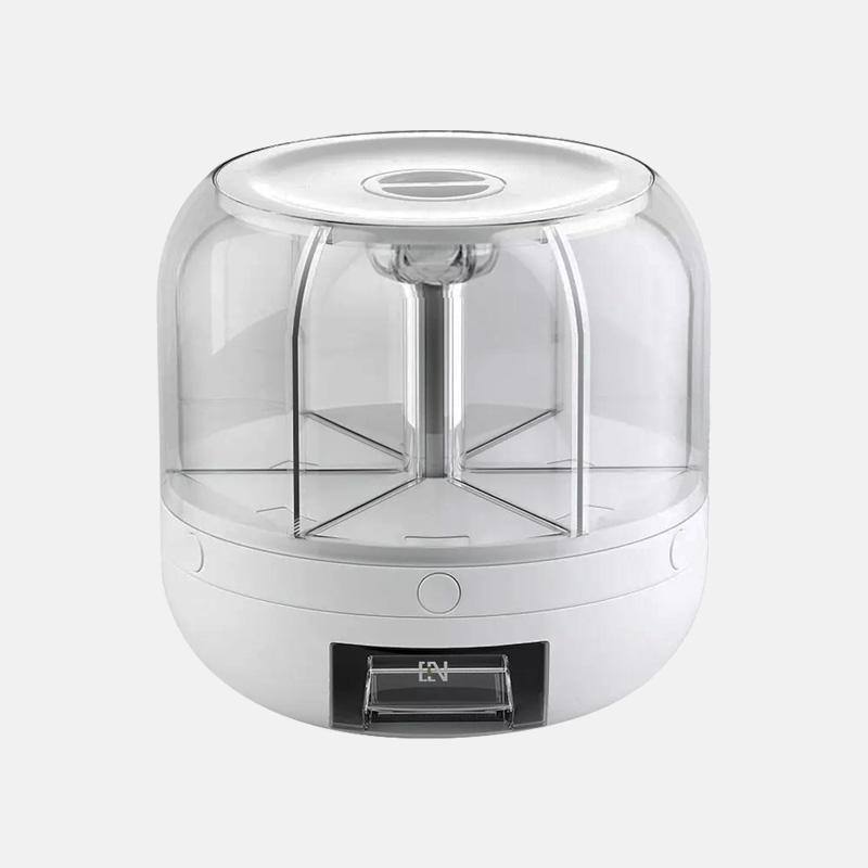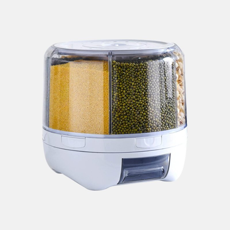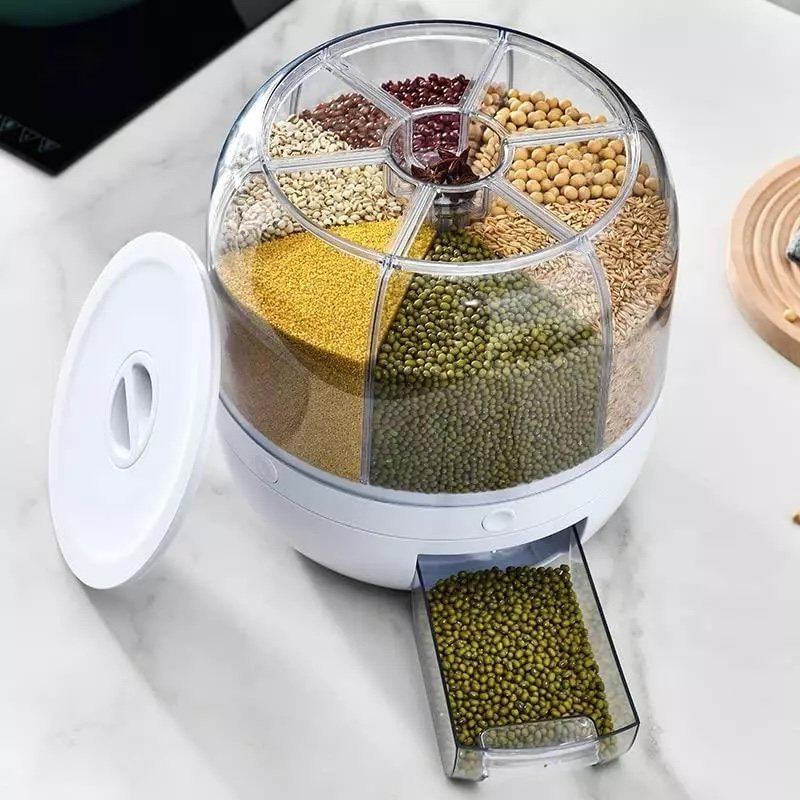 Кожна секція дозволяє зберігати різні продукти окремо, що полегшує їх використання та допомагає утримувати кухню в порядку. Завдяки механізму, що обертається, диспенсер легко повертається, що забезпечує швидкий доступ до потрібних продуктів під час приготування їжі.