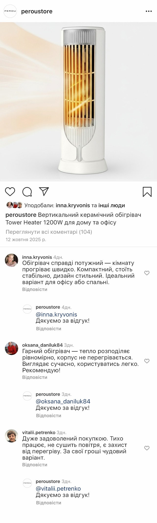 Обігрівач має вертикальну конструкцію у вигляді башти, що економить місце та сприяє рівномірному розподілу тепла завдяки функції обертання. Для безпеки передбачено захист від перегріву та перекидання.