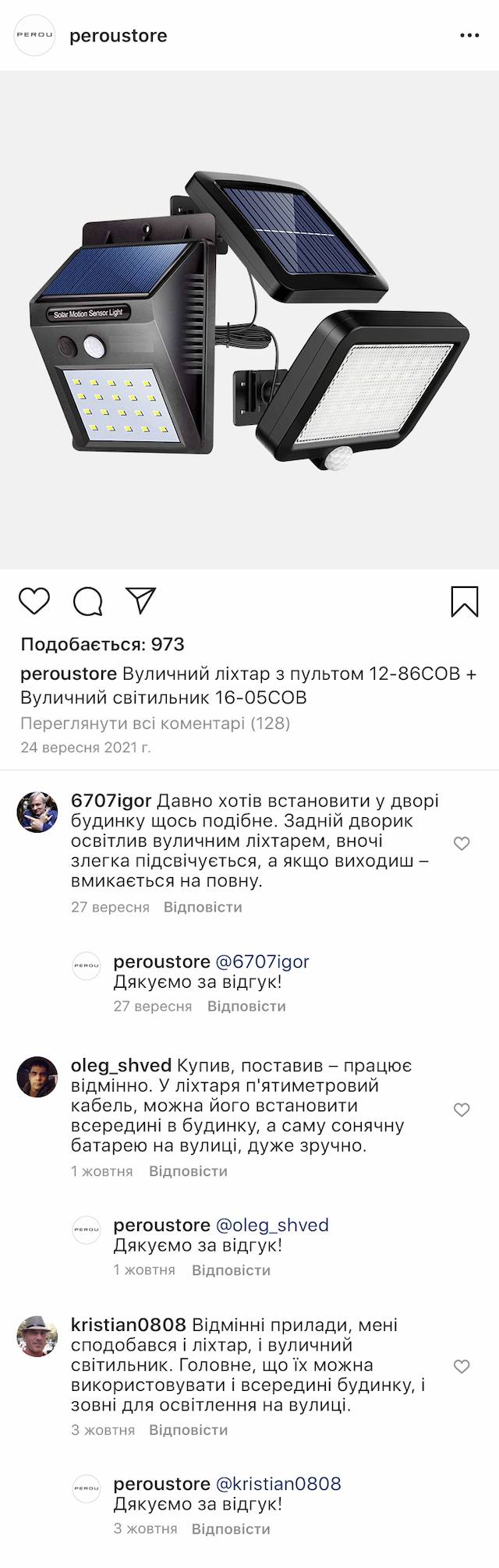 Датчик руху автоматично вмикає прилади, якщо людина підходить на відстань 4 – 5 метрів. Вуличний світильник світить 25-30 секунд, після чого гасне при відсутності руху. А вуличний ліхтар продовжує світити, але зменшує яскравість до 50%, тому його можна використовувати там, де потрібне постійне підсвічування в темний час доби (налаштування через пульт).