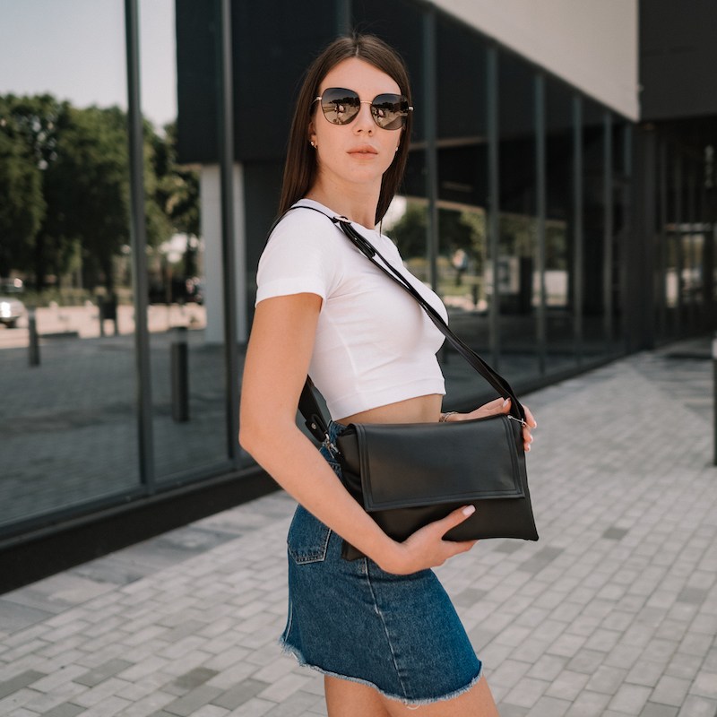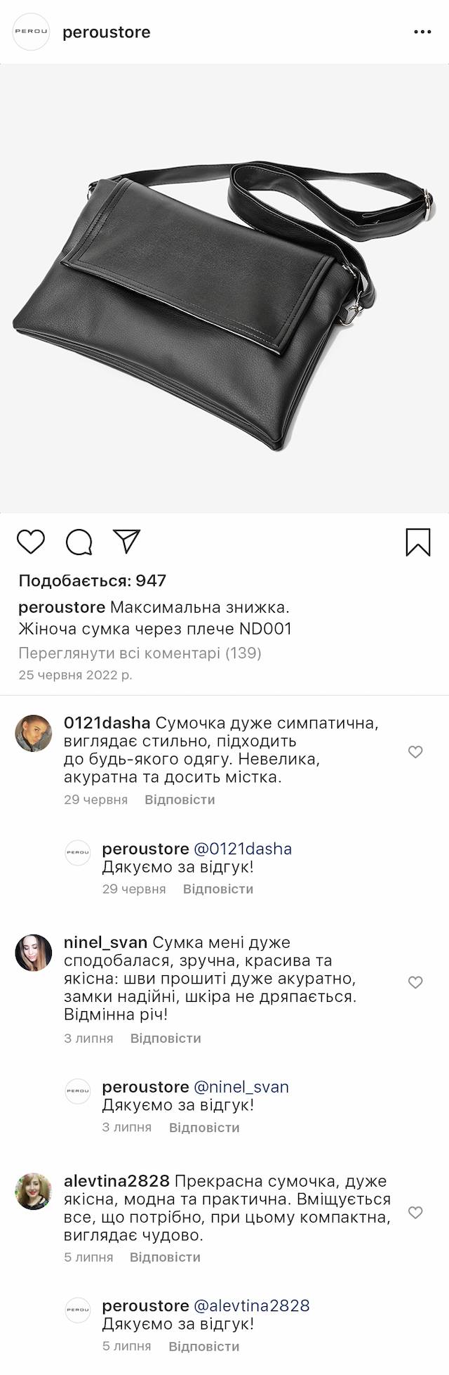 Сумка зроблена з м’якої екошкіри, відрізняється високою якістю виконання: оздоблення швів, рівний рядок, надійність замків та кнопок. Міцний подовжений ремінець дозволяє носити її як через плече, так і в руці.
