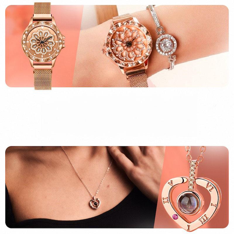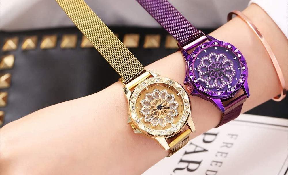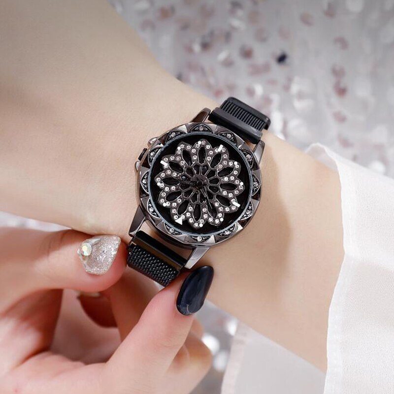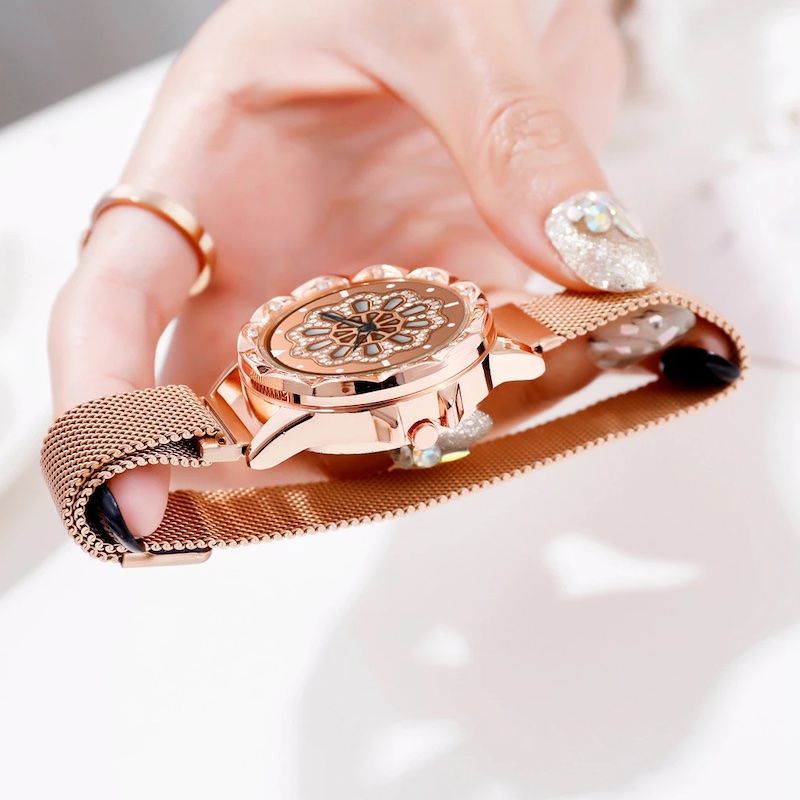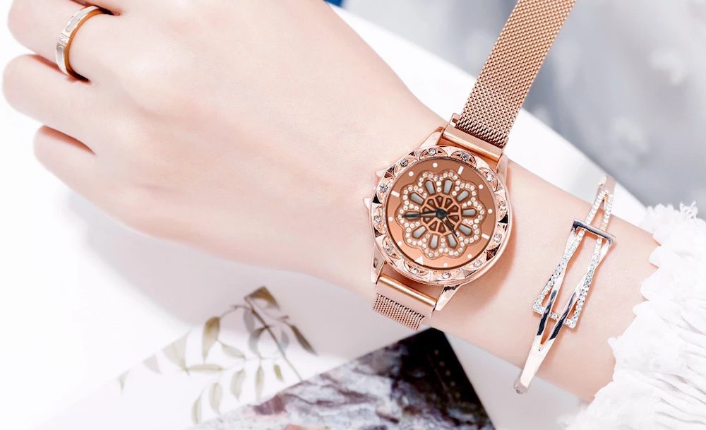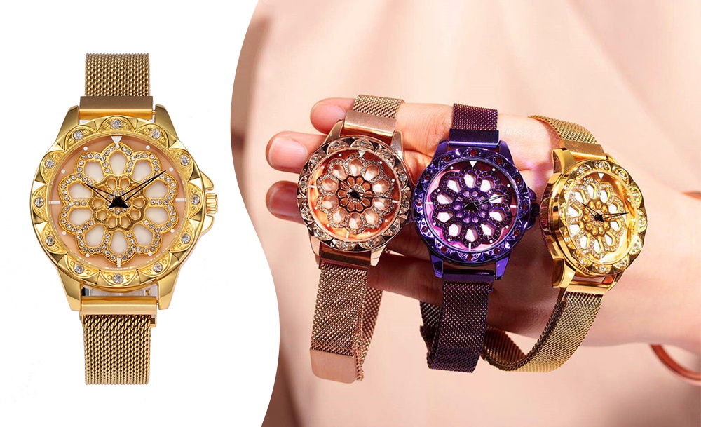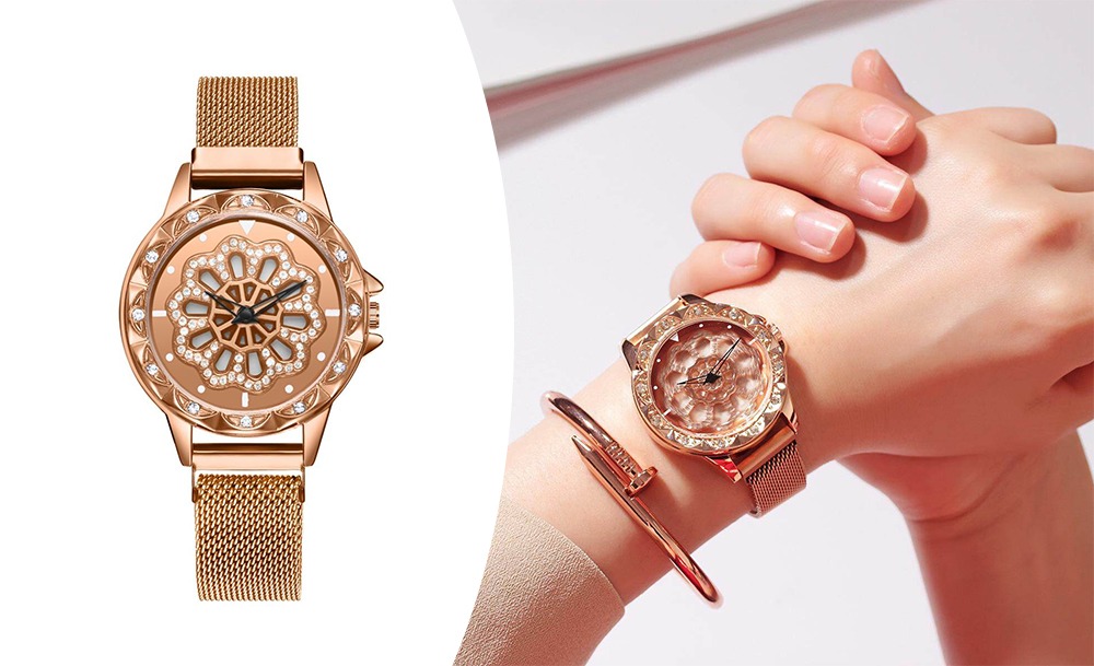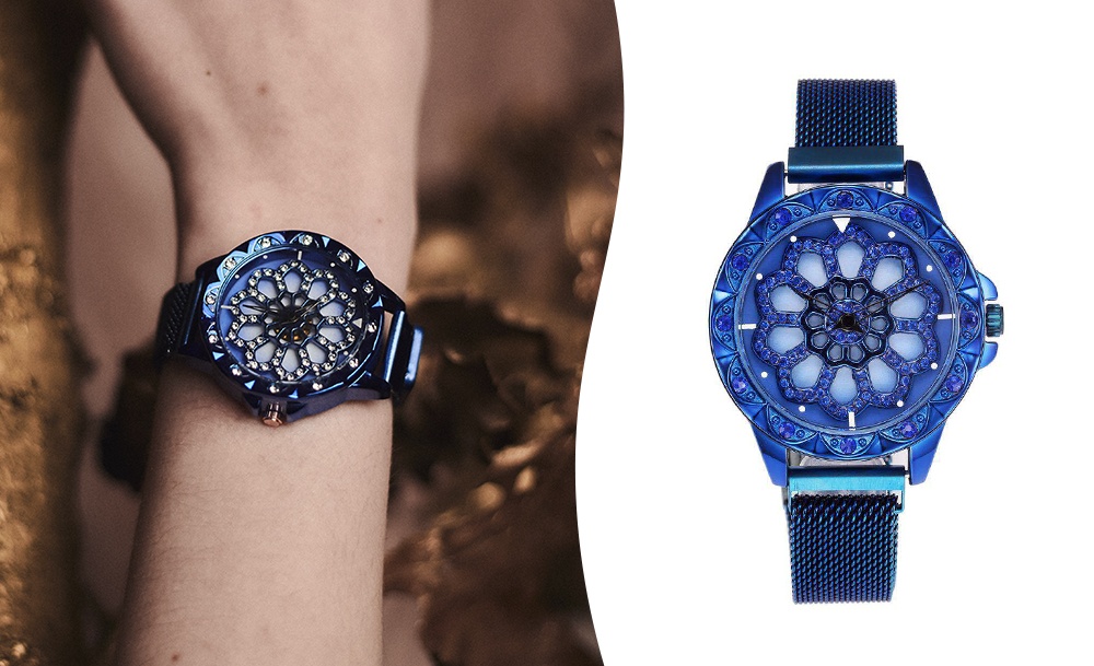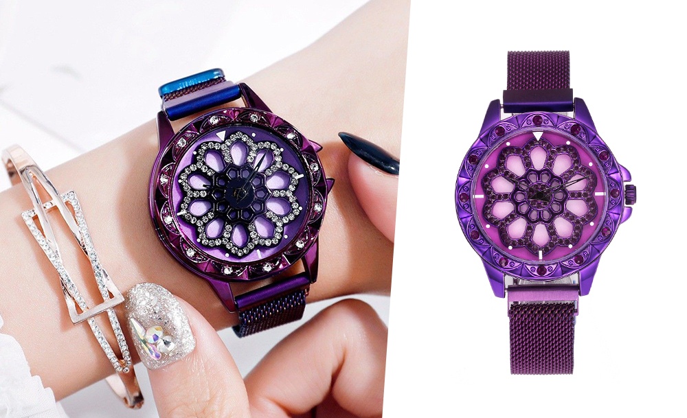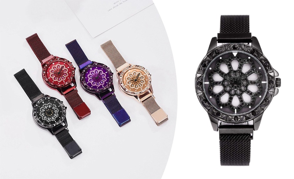 Жіночий годинник з циферблатом, що обертається, підійде до будь-якого вбрання і стане чудовою прикрасою для модниці. Магнітний металевий ремінець приємно облягає зап’ястя руки, а циферблат, прикрашений дрібними камінцями, надає ефектного та елегантного вигляду. Кварцовий механізм відрізняється надійністю та точністю, а корпус виконаний із високоякісних матеріалів.
