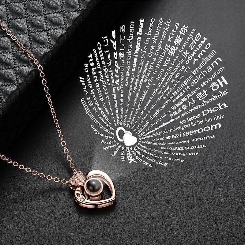 Кулон серця з проекцією – це оригінальний подарунок, який не залишить байдужою жодну жінку. Фраза «Я люблю тебе» виконана 100 мовами; вона стає видна, якщо підсвітити ліхтариком або вивести на екран телефону.