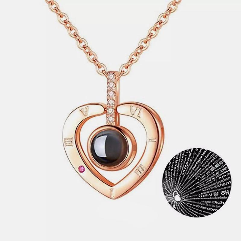 Кулон серця з проекцією – це оригінальний подарунок, який не залишить байдужою жодну жінку. Фраза «Я люблю тебе» виконана 100 мовами; вона стає видна, якщо підсвітити ліхтариком або вивести на екран телефону.